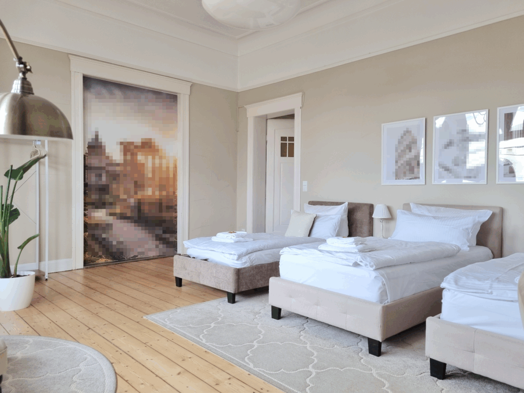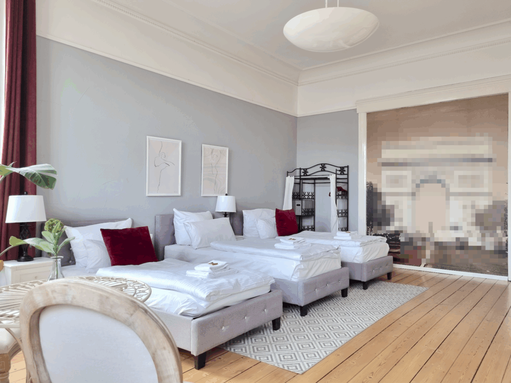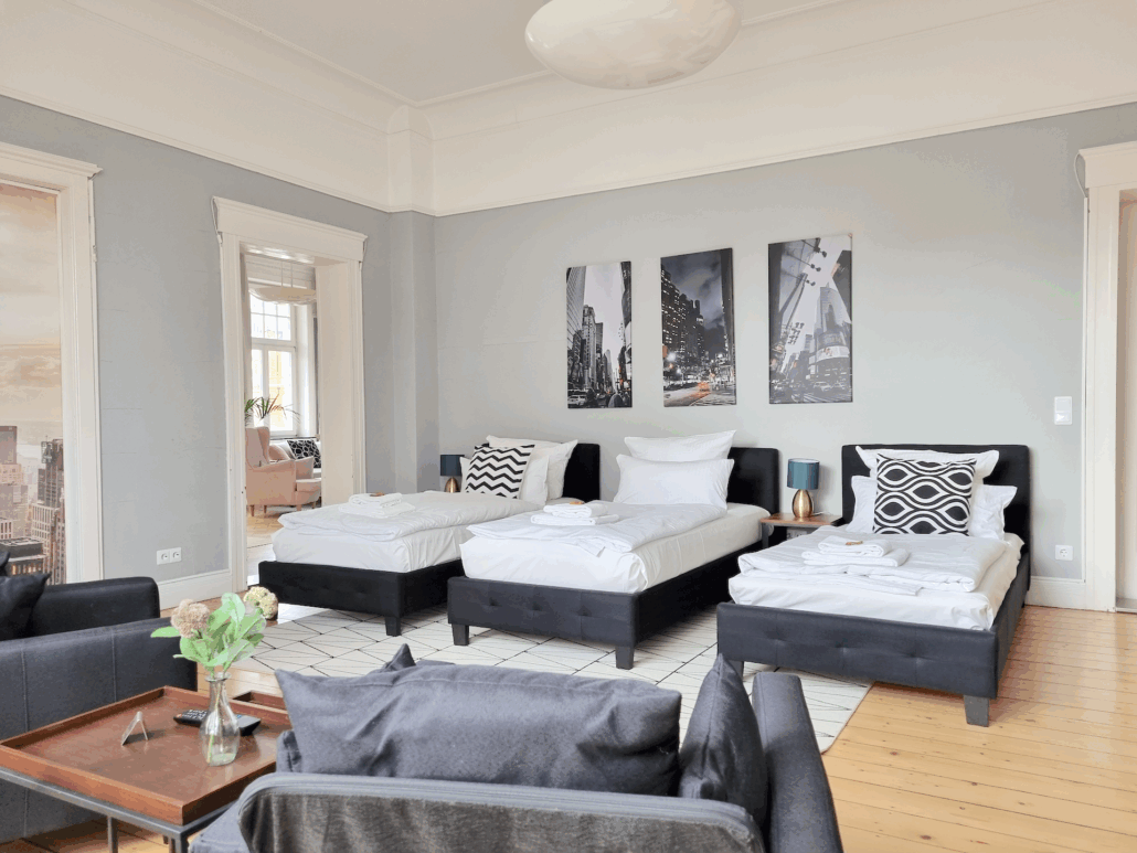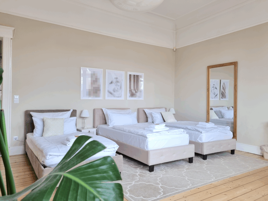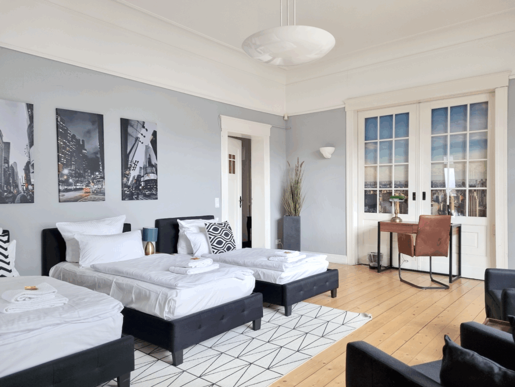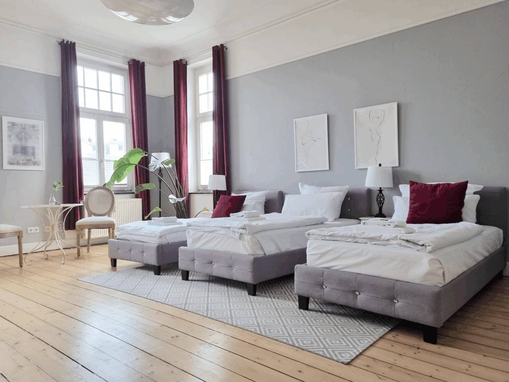 The flat has three very spacious bedrooms, each more than 30 square metres in size, in the style of Rome, Paris and New York. They are each equipped with three comfortable upholstered beds (0.90 x 2.00m), which can be quickly pushed together if required and used as double beds (1.80 x 2.00m). There is also enough space for a baby cot. Each bedroom has a 40- or 43-inch smart TV and a writing/dressing table. Fast WiFi is available throughout the flat.