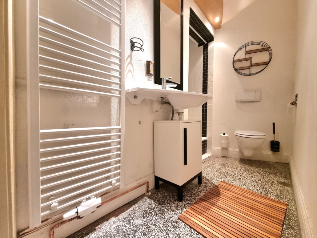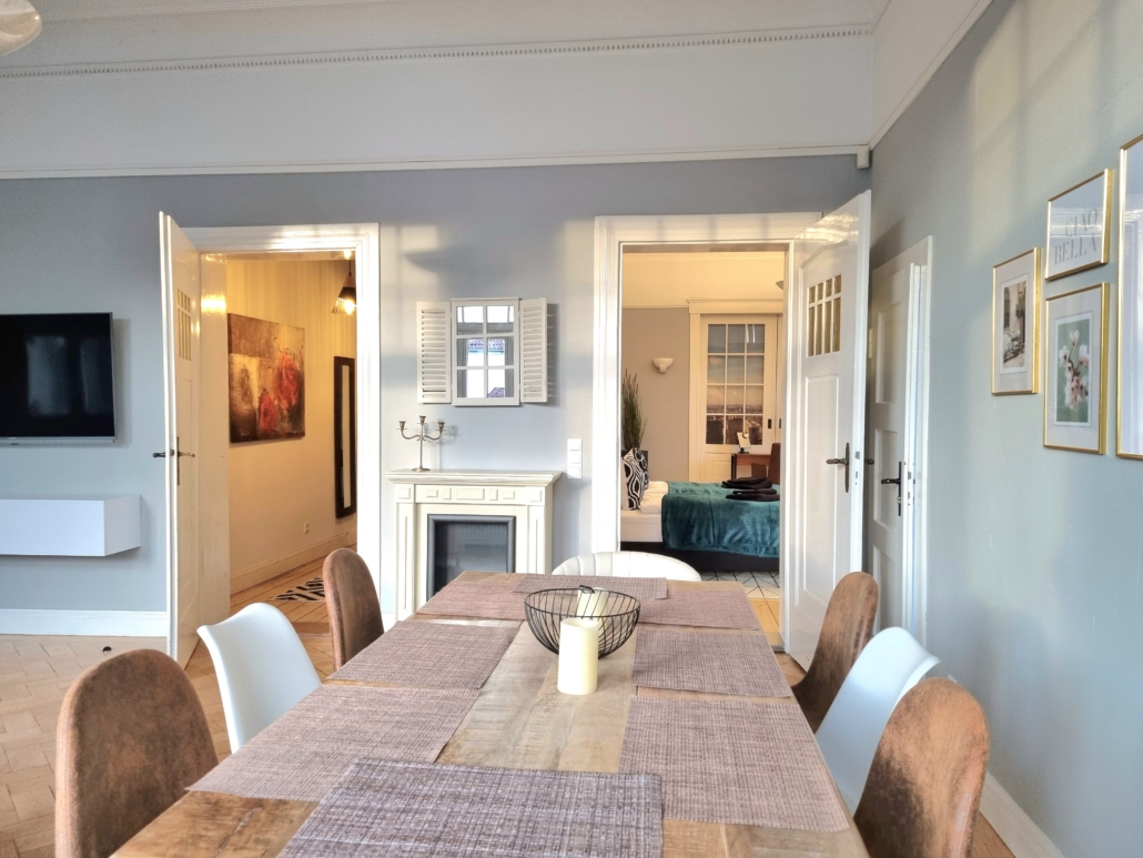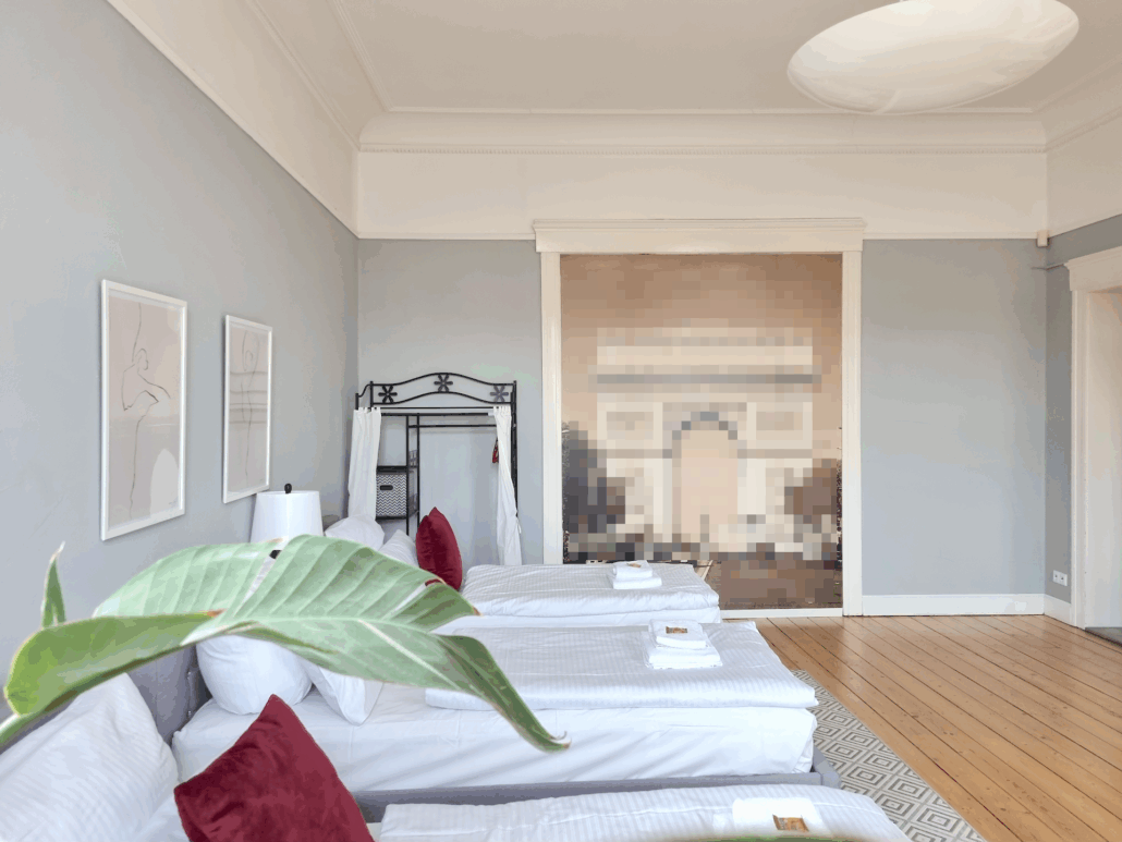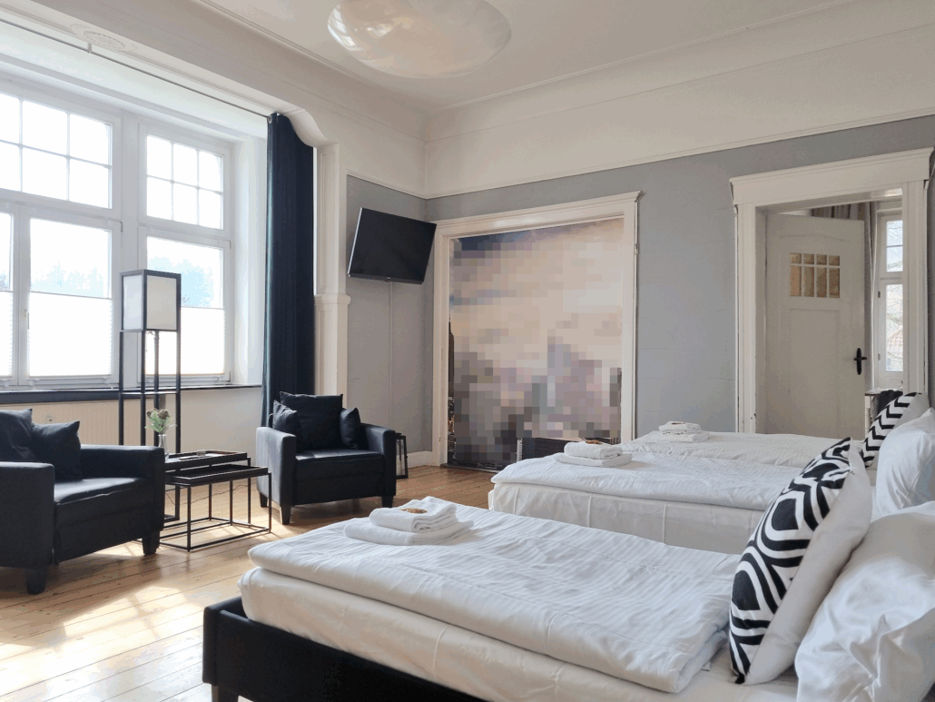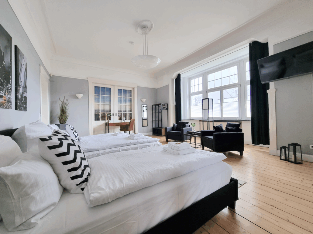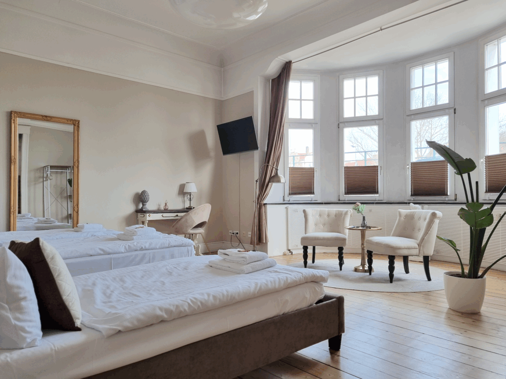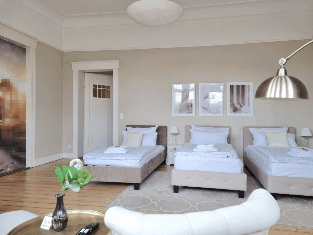 The flat has three very spacious bedrooms, each more than 30 square metres in size, in the style of Rome, Paris and New York. They are each equipped with three comfortable upholstered beds (0.90 x 2.00m), which can be quickly pushed together if required and used as double beds (1.80 x 2.00m). There is also enough space for a baby cot. Each bedroom has a 40- or 43-inch smart TV and a writing/dressing table. Fast WiFi is available throughout the flat.