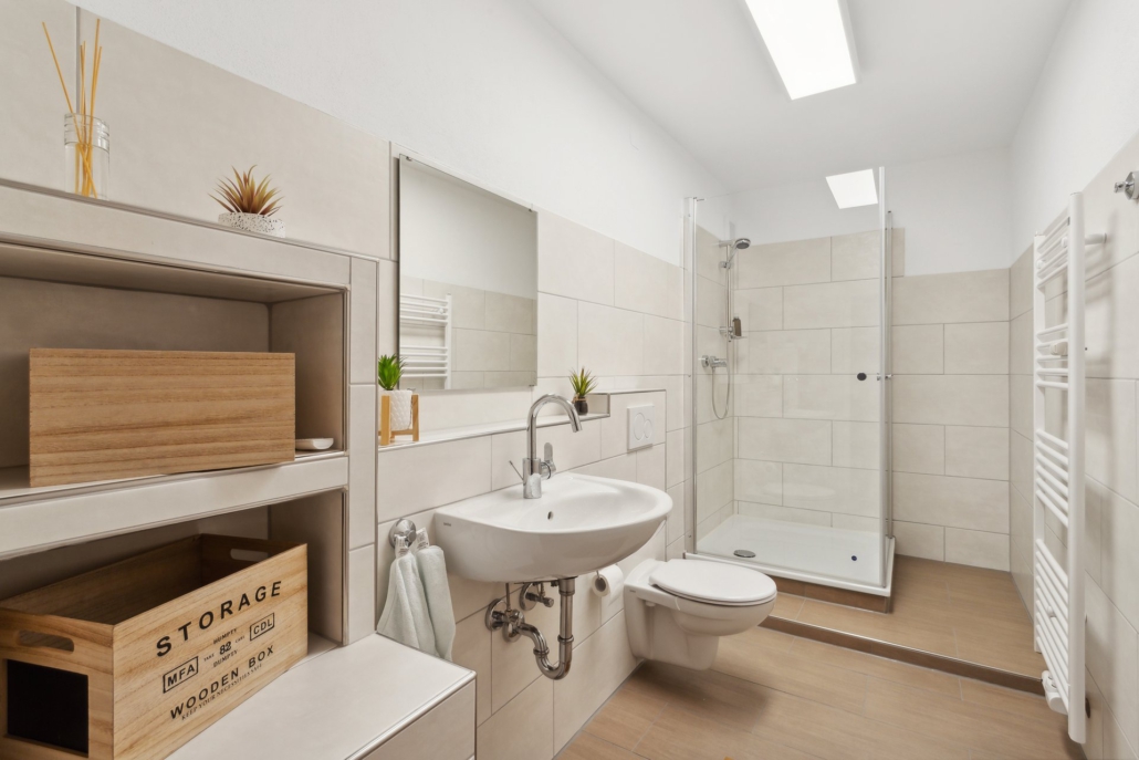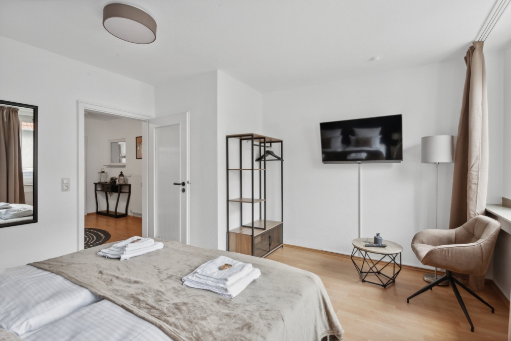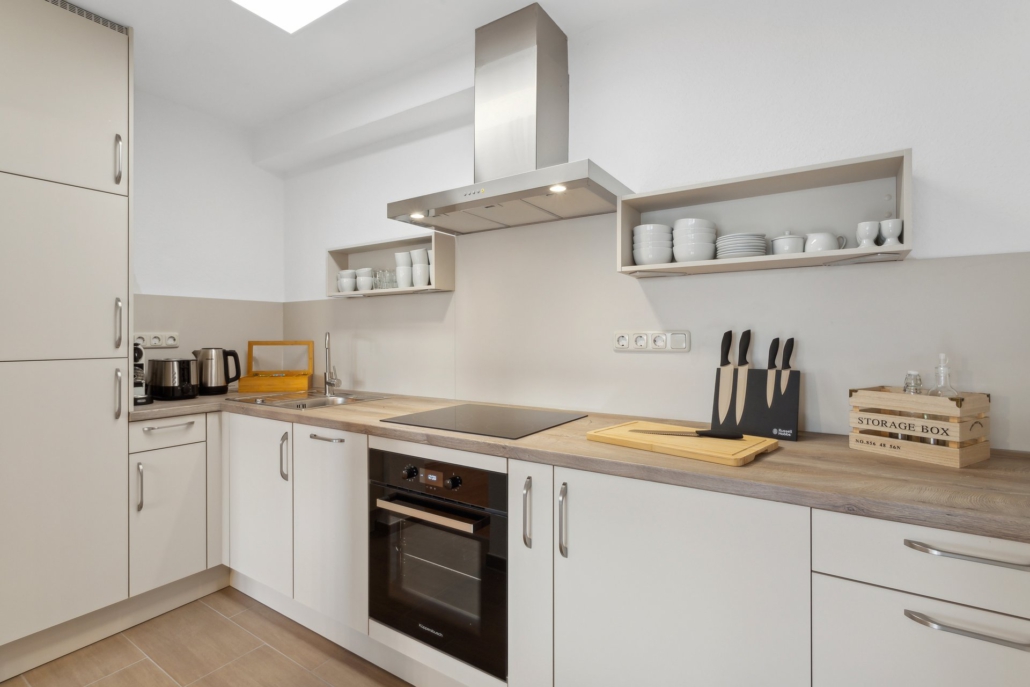 It has two tastefully furnished bedrooms with comfortable upholstered beds and high-quality hotel bed linen. In the first bedroom there are two single beds (0.90*2.00m), which can be quickly pushed together and used as a double bed if required. In the second bedroom there is a 1.80*2.00m upholstered bed for cosy nights. A 43-inch smart TV is available in both bedrooms.