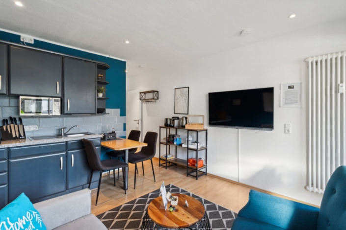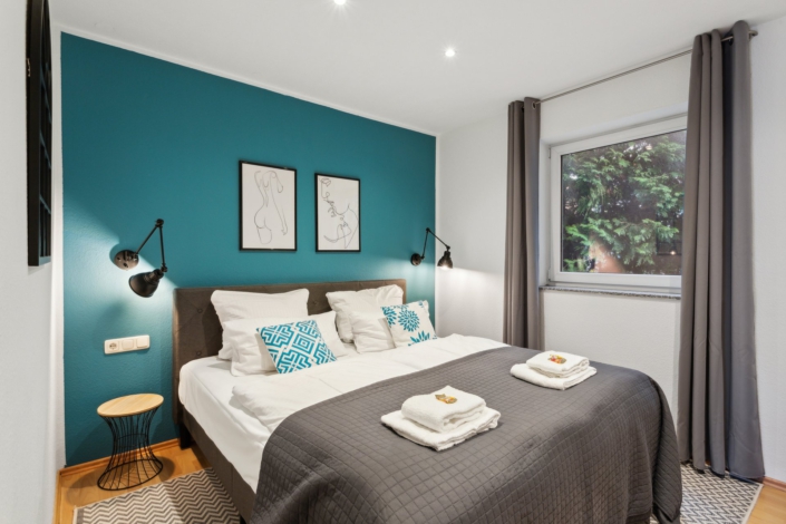 In the bedroom of the apartment there is a 1.80m wide double bed. The couch in the living room can quickly be converted into a sleeping space for another person. Alternatively, there would also be room for a baby bed for the little ones in this room. The windows of the apartment can be completely darkened.