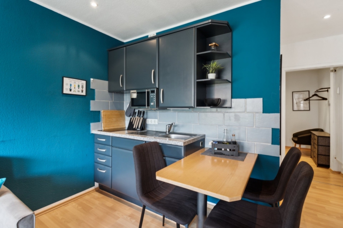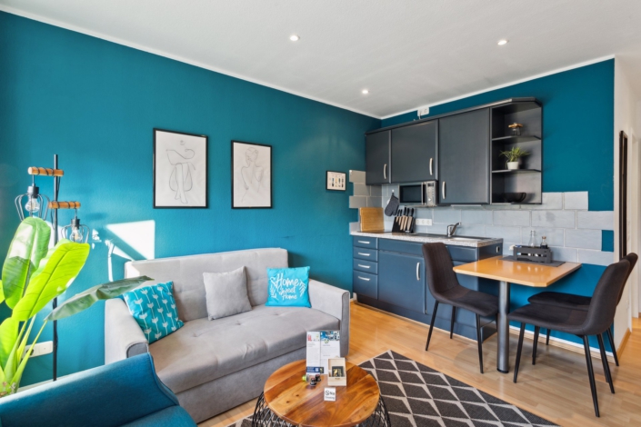 The 30m² Azurro Suite combines urban design with calming blue tones. Dark wood, clear shapes and cool colours create a clear, minimalist style – perfect for business guests, city travellers or anyone looking for peace and quiet in a stylish ambience. Here you can relax – with style and structure.