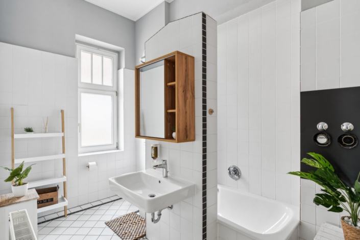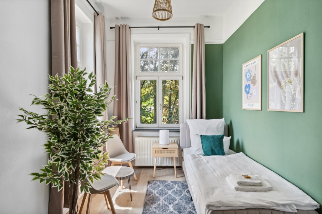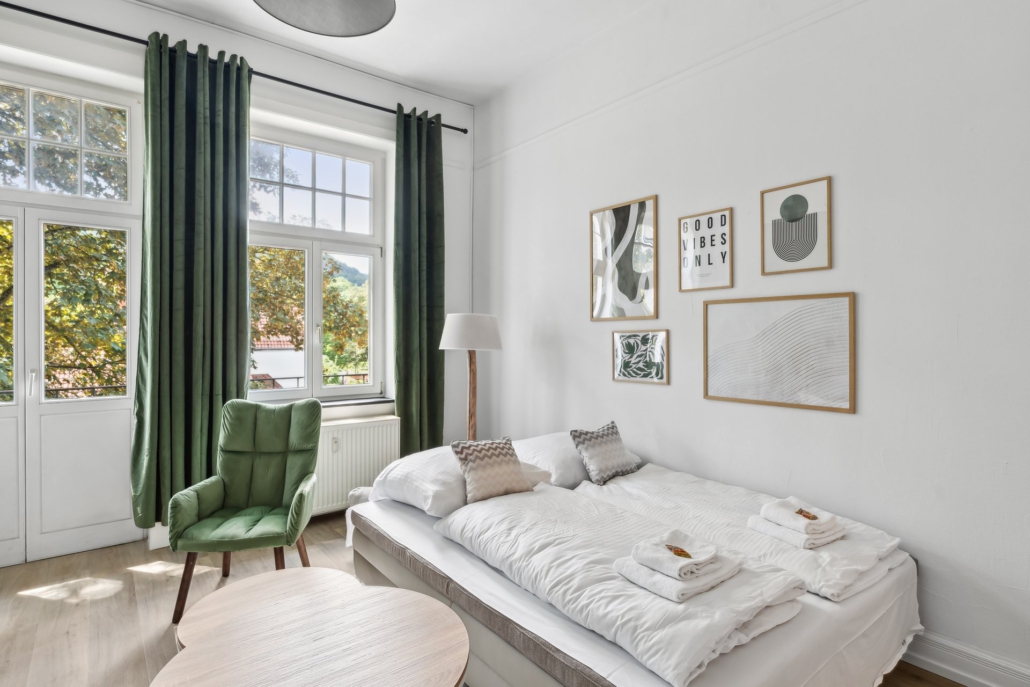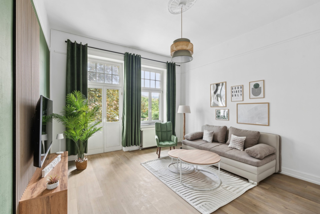 The impressions give you a glimpse of the stylishly furnished bedrooms, the inviting living area with a large sofa bed, the modern kitchen with dining space, the timeless bathroom, and the balcony facing the garden. Architectural details of the Art Nouveau villa also offer you a first impression of the unique atmosphere that awaits you in the “Natur-Oase”vacation rental.